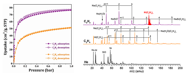 江凌團(tuán)隊(duì)利用自主研制的紅外光解離實(shí)驗(yàn)裝置,對(duì)Ni@FAU對(duì)乙炔/乙烯的吸附機(jī)制進(jìn)行了研究,成功探測(cè)到了Ni(C2H2)3,然而并沒(méi)有發(fā)現(xiàn)Ni(C2H4)n。該實(shí)驗(yàn)結(jié)果證實(shí),Ni@FAU對(duì)乙炔具有較高的吸附選擇性,具有在混合氣流中去除痕量乙炔的分離能力,確認(rèn)了基于化學(xué)鍵的炔烴/烯烴分離的新策略,有望推動(dòng)Ni@FAU分子篩材料在相關(guān)工業(yè)吸附分離過(guò)程中的應(yīng)用。利用先進(jìn)的譜學(xué)技術(shù)從分子、團(tuán)簇、表界面多層次揭示能源小分子與催化劑的化學(xué)反應(yīng)規(guī)律,為新型高效吸附催化材料的設(shè)計(jì)開(kāi)發(fā)提供了新的思路。