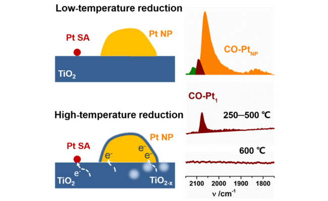 近日,大連化物所催化與新材料研究室喬波濤研究員和張濤院士團隊在單原子金屬-載體強相互作用研究方面取得新進展,首次發(fā)現(xiàn)Pt單原子能夠與TiO2載體間發(fā)生經(jīng)典金屬-載體強相互作用(Strong Metal-Support Interaction, SMSI),但其所需發(fā)生溫度較Pt NPs更高,且Pt單原子失去CO吸附能力的原因與Pt NPs不同,不是載體的物理覆蓋,而是配位飽和。