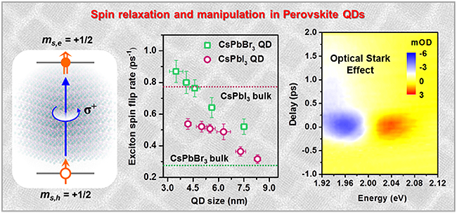 鉛鹵素鈣鈦礦除了應用于光電器件以外,在自旋電子學和量子信息學領域也有重要的基礎研究價值。這是因為鉛元素導致強烈的自旋-軌道耦合,特別適合通過光學手段注入自旋并進行自旋相關性質的操縱。然而,自旋-軌道耦合在另一方面也導致快速的自旋翻轉,限制了光生載流子的自旋壽命。該團隊提出,強限域的鈣鈦礦QD具有離散的帶邊能級,有可能通過抑制聲子散射的方式延長自旋壽命。該團隊采用圓偏振飛秒泵浦光共振激發自旋(或準自旋)量子態,并利用具有相同或相反圓偏振的飛秒光探測量子態信號的衰退或增長,以此獲得自旋翻轉動力學。研究結果表明,雖然量子限域可在一定程度抑制聲子散射機制,但QD中存在著納米尺寸誘導的超快自旋馳豫機制。這些機制包括電子-空穴交換作用,表面散射以及自旋與表面懸鍵自旋相互作用導致的自旋翻轉等,且在不同材料中存在普適性的尺寸依賴規律。這些物理規律為鈣鈦礦QD在自旋相關領域的應用提供了重要的研究基礎。