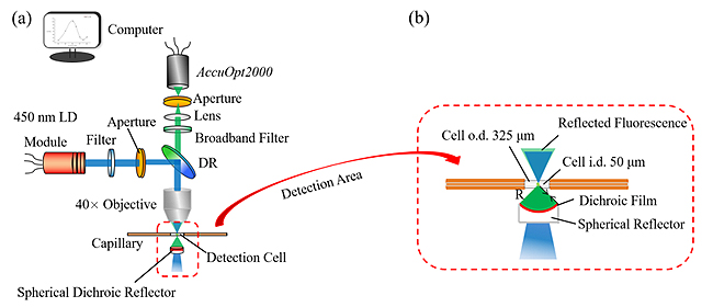 (a) 激光誘導(dǎo)熒光檢測器原理圖;(b)放大的球面二向色反光鏡原理圖