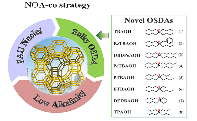 該項(xiàng)研究中,研究團(tuán)隊(duì)提出高硅Y沸石的合成新策略(NOA-co策略),在高分散的FAU晶核溶液、較大體積的有機(jī)模板劑、低堿度的合成凝膠三者協(xié)同作用下實(shí)現(xiàn)了其直接合成。基于NOA-co策略,研究團(tuán)隊(duì)發(fā)現(xiàn)多種高效合成高硅Y沸石的有機(jī)模板劑,并對(duì)晶化機(jī)理進(jìn)行了探討。