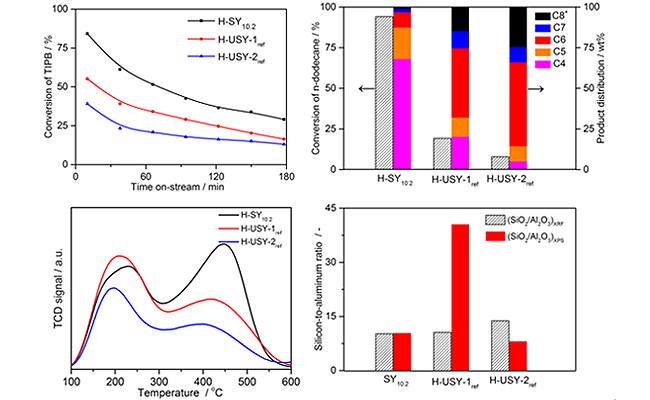 NOA-co策略合成的高硅Y沸石的粒徑尺寸為100至250 nm,具有高的結(jié)晶度、優(yōu)異的熱/水熱穩(wěn)定性。與后處理法所得的高硅Y沸石相比,NOA-co策略直接合成的材料具有更多的強(qiáng)酸中心,且酸中心分布相對(duì)均勻,在大分子原料的裂化反應(yīng)中表現(xiàn)出優(yōu)異的催化活性。NOA-co策略的提出為高硅沸石的合成提供了研究新思路。