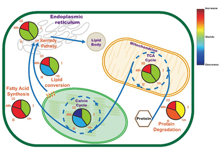 針對這一問題,游武欣和魏力帶領的中德聯合研究小組,發表了微擬球藻缺氮脅迫下時間系列的蛋白質組數據,結合相對應的轉錄組與代謝組數據,應用最新的統計分析方法,較為全面地揭示了細胞在缺氮脅迫下合成甘油三酯的過程特征。