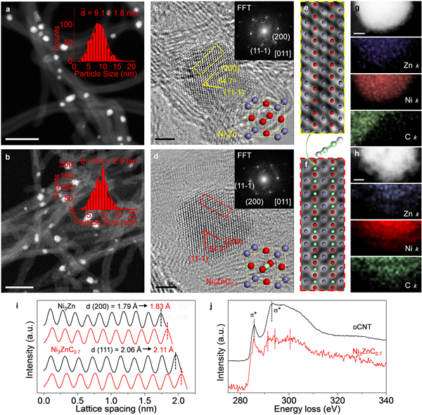 金屬所沈陽材料科學國家研究中心聯合研究部張炳森研究團隊一直致力于乙炔選擇性加氫催化劑的結構解析、設計及研制工作。通過多種原位手段對乙炔選擇性加氫催化劑的活性結構形成及其在反應條件下的演變進行全方位解析,并與反應性能關聯,為精準建立乙炔選擇性加氫催化劑的“合成條件-活性結構-反應性能”關系建立奠定基礎,進而為高效加氫催化劑的設計工作提供指導。近日,基于研究團隊在乙炔選擇性加氫催化劑的相關研究工作(Chem. Commun. 2020, 56, 6372; Angew. Chem. Int. Ed. 2019, 58, 4232; ChemCatChem 2017, 9, 3435),金屬所張炳森研究員、北京化工大學衛敏教授、吉林大學張偉教授及瑞士蘇黎世聯邦理工大學黃興博士和Marc-Georg Willinger博士等人合作,通過引入鋅原子對鎳的電子結構和八面體間隙體積進行精確調控,捕捉了乙炔在鎳基納米粒子表面自發吸附、解離并進入形成間隙碳化物Ni3ZnC0.7結構的完整過程。采用原位X射線衍射、原位同步輻射和透射電子顯微等研究手段對催化劑結構及其演變進行了表征,發現間隙碳原子通過與六個鎳原子的配位,可有效調控鎳的原子間距離和電子結構,提高其在乙炔選擇性加氫反應中的選擇性和穩定性,該工作為高效非貴金屬加氫催化劑的設計和制備提供了新思路。相關研究成果近日以“Manipulating interstitial carbon atoms in the nickel octahedral site for highly efficient hydrogenation of alkyne”為題發表在《自然-通訊》(Nature Communications)期刊上,論文的第一作者為金屬所牛一鳴博士。