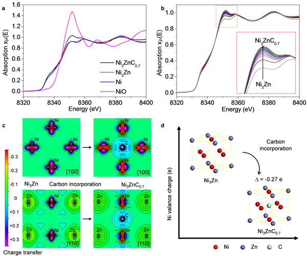 圖4. Ni3Zn和Ni3ZnC0.7結構中鎳的電子結構及其原位演變