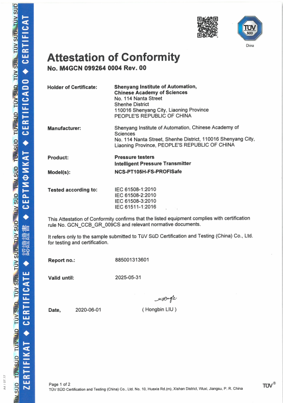 近日,中國科學院沈陽自動化研究所獲得了國際認證機構T V (南德意志大中華集團)頒發的總線型智能壓力變送器SIL2/3功能安全認證證書,這是我國首張總線型壓力變送器安全認證證書。此前,沈陽自動化所獲得了該機構頒發的智能溫度變送器SIL2/3功能安全認證證書。