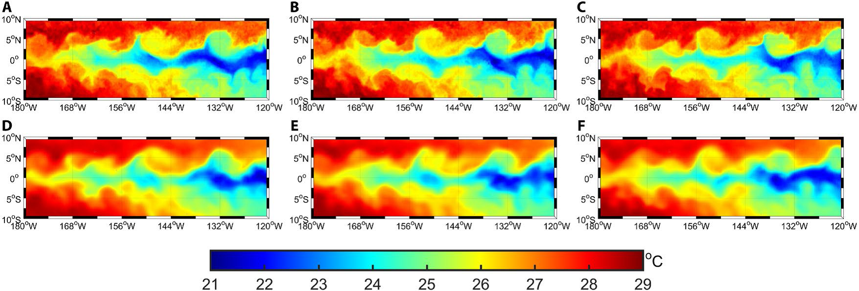 衛星觀測的熱帶不穩定波海表溫度場(A 至 C)和深度學習預報的海表溫度場(D至F)的時空演變