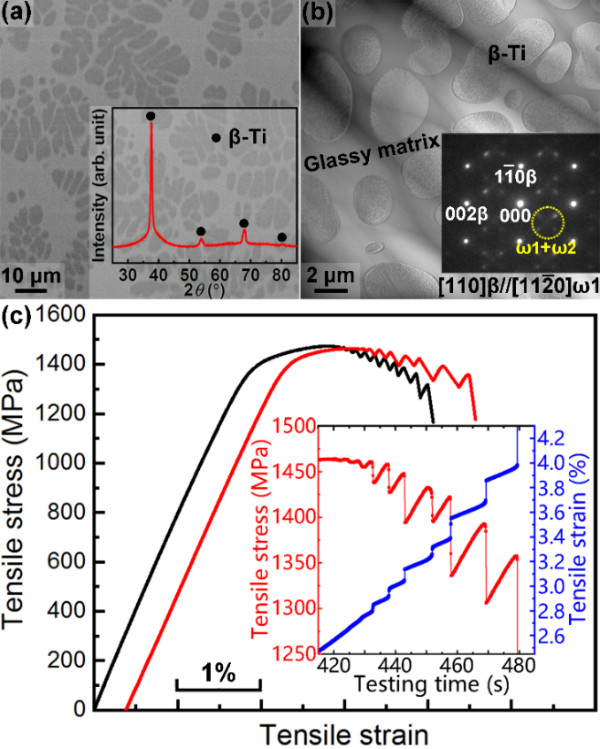 圖1:非晶內生亞穩 -Ti復合材料的微觀組織和拉伸應力-應變曲線