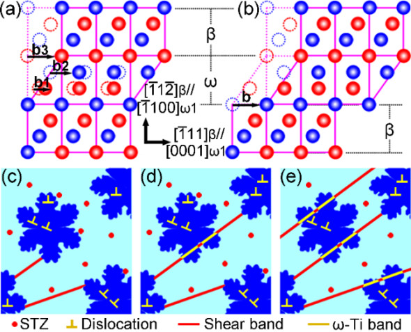 圖3: 到 的相轉變以及非晶內生復合材料中剪切帶與 -Ti帶的協同剪切機制