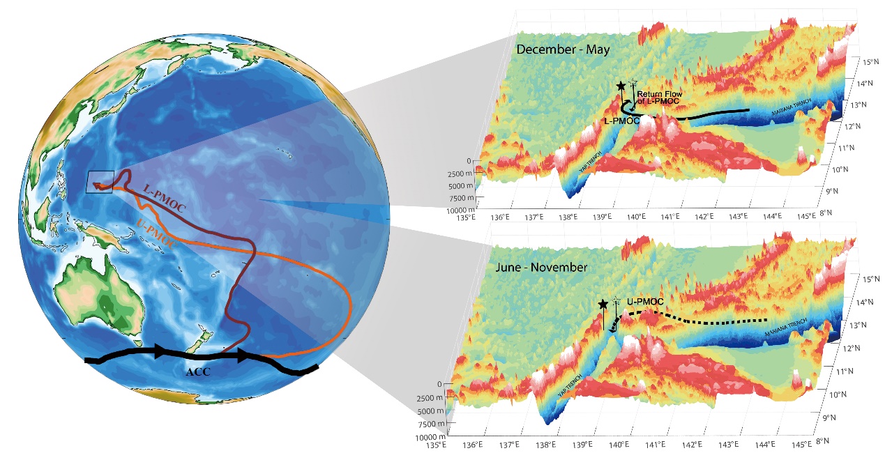 雅浦-馬里亞納海溝連接區是深層經向翻轉環流進入西太平洋的關鍵要塞通道,王凡研究團隊在這一區域開展了長期的潛標觀測。基于上述數據,團隊發現深層經向翻轉環流上下兩個分支(L-PMOC和U-PMOC)具有顯著的季節變化:位于通道西側3800-4200米北向的L-PMOC在12月至次年5月流速較強,可達20 cm s-1,6月至11月,流速較弱,且在通道東側4000米以深存在南向的L-PMOC回流,其具有和L-PMOC一樣的季節位相,但強度相對較弱;而位于通道東側3000-3800米南向的U-PMOC,其季節位相與L-PMOC相反,即12月至次年5月,流速較弱,6月至11月,流速較強。L-PMOC和U-PMOC的季節變化分別伴隨著上層繞極深層水(UCPW)和下層繞極深層水(LCPW)的季節性入侵。