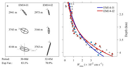 除季節變化外,團隊還發現該深水通道3000米以深的深層流和溫度存在顯著的30-90天季節內變化特征,而且季節內變化強度隨深度增加,在4200米深度上觀測到的流速和等溫線垂向振幅可分別達45 cm s-1和600米。經過深入分析,團隊揭示了上述季節內深層強化現象是由地形羅斯貝波引起,深層流速和溫度變化振幅的垂向結構特征符合地形羅斯貝波的特性。結合模式數據,團隊進一步討論了該深水通道地形羅斯貝波的產生機制,其主要包括兩個過程,一是表層的強渦旋通過位渦調整激發產生地形羅斯貝波;二是大尺度平均流的正壓和斜壓不穩定激發產生地形羅斯貝波。