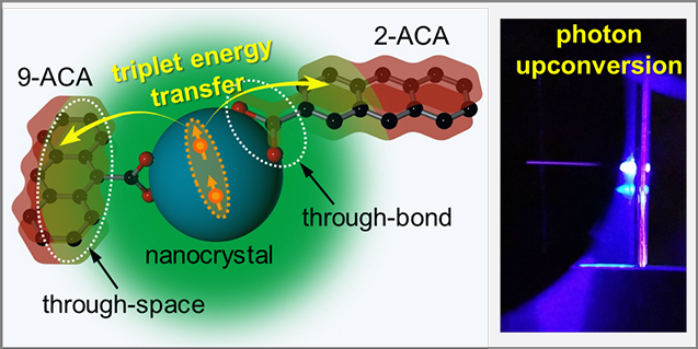 近日,中國科學院大連化學物理研究所光電材料動力學特區研究組研究員吳凱豐團隊通過同時調控無機半導體納米晶的波函數分布和表面受體分子的構型,采用時間分辨光譜觀測到了無機/有機界面三線態能量轉移中的“Through-space”與“Through-bond”機制,并基于此實現了高效的分子三線態敏化和三線態湮滅的光子上轉換。