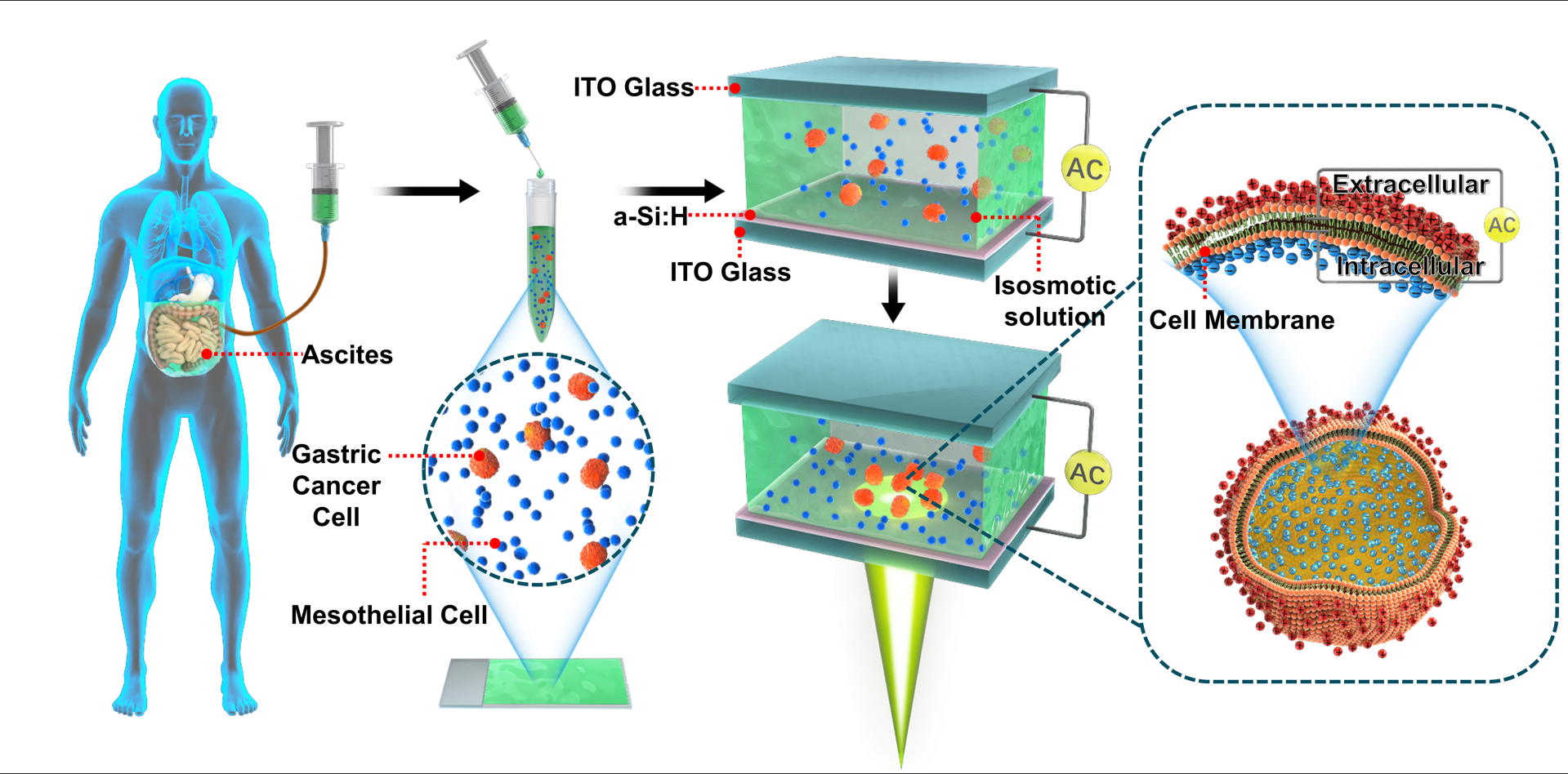 研究團隊提出一種基于光誘導微納操控的新型微流控芯片,能將胃癌細胞從患者腹水種分離出來,并測量這些細胞的電學特性。研究表明,胃癌細胞與腹腔游離細胞的大小和電學特性差異顯著。通過實驗,研究人員從6位患者的腹水中分離出胃癌細胞,純度達到71%,完成分離過程僅需要5分鐘。該項研究可為揭示胃癌腹膜轉移機制的提供實驗手段,并有望發展成胃癌腹膜轉移的臨床快速診斷的新技術。