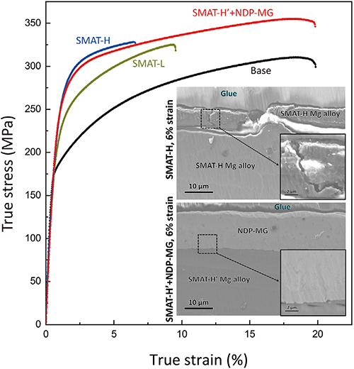 圖3.雙相金屬玻璃+SMAT(NDP-MG coated SMAT-H′)鎂合金室溫力學(xué)性能