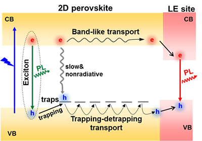 二維(2D)有機無機雜化鈣鈦礦半導體量子阱材料是在三維(3D)鈣鈦礦晶格中插入長鏈有機鹵化胺配體形成的。由于2D鈣鈦礦具有獨特的性質,如柔性結構,大的激子結合能,易調諧帶隙,以及顯著提高的耐濕性,使得其在光電和量子器件應用領域得到廣泛關注。以往研究普遍認為2D鈣鈦礦中載流子以激子形式存在,受到激子壽命和遷移率的限制,其激子遷移距離只有數百納米,比3D鈣鈦礦材料小一個量級以上。基于文獻中報道的載流子輸運特性,在依賴于載流子長距離輸運器件應用方面,2D鈣鈦礦可能無法與3D鈣鈦礦和其他傳統半導體量子阱材料相媲美。
