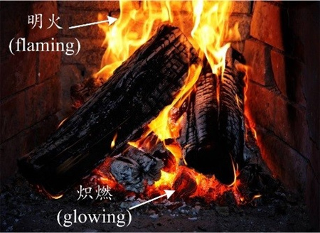 木材等生物質(zhì)的燃燒過程包括揮發(fā)分的明火燃燒(flaming combustion)和殘留焦炭(殘?zhí)浚┑臒肴迹╣lowing combustion)(如圖1所示)。相對于明火燃燒,殘?zhí)康臒肴寄軌蛟跇O度欠氧條件下維持,有反應(yīng)溫和、持續(xù)時間長的特點,通風(fēng)條件良好時能夠再次引發(fā)劇烈的明火燃燒。所以殘?zhí)繜肴紮C理的研究對于生物質(zhì)的高效清潔燃燒以及森林火災(zāi)、木質(zhì)建筑火災(zāi)的預(yù)警和撲救有重要的指導(dǎo)意義。