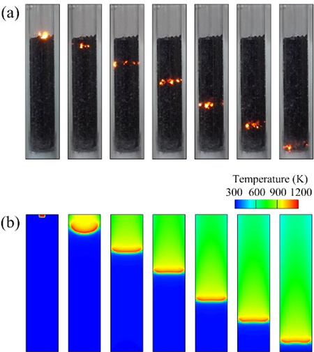 圖2 熾燃鋒面的蔓延:(a)實驗現(xiàn)象;(b)模擬結(jié)果。