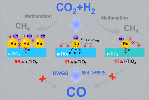 該團(tuán)隊(duì)通過改變TiO2載體的晶形和貴金屬Ru的負(fù)載量,實(shí)現(xiàn)了CO2加氫產(chǎn)物選擇性的調(diào)控。研究表明,在反應(yīng)氣氛下,不同晶形載體擔(dān)載的Ru基催化劑呈現(xiàn)出截然不同的產(chǎn)物選擇性,在負(fù)載量為1wt%時(shí),金紅石型TiO2擔(dān)載的催化劑主要生成CH4 ,銳鈦礦型TiO2擔(dān)載的催化劑主要生成CO,首次實(shí)現(xiàn)Ru納米粒子表面CO2加氫產(chǎn)物選擇性的調(diào)控。通過多種原位表征技術(shù)并結(jié)合理論計(jì)算發(fā)現(xiàn):反應(yīng)條件下,氫溢流并伴隨著金屬-載體間的電子轉(zhuǎn)移可以影響中間體CO的吸附和活化,進(jìn)而改變Ru基催化劑的CO2加氫反應(yīng)選擇性。基于這種認(rèn)識,不但可以調(diào)控CO2加氫反應(yīng)的選擇性,而且可以改變其它催化(如CO選擇氧化)反應(yīng)的性能,這為涉氫反應(yīng)催化劑的科學(xué)設(shè)計(jì)提供了新思路。