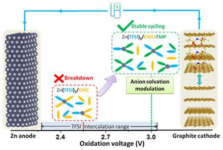 近日,該研究組利用二價鋅離子易與陰離子形成締合離子對這一特點,在Zn(TFSI)2 /EMC(碳酸甲乙酯)電解質中通過引入具有強供電子能力的磷酸三甲酯(TMP)溶劑將TFSI-陰離子以締合離子對的形式“束縛”在TMP的溶劑化區域中,實現了EMC溶劑分子與陰離子的“解耦”分離,降低了氧化穩定性較差的EMC-TFSI-的濃度。電化學測試結果表明,這種陰離子溶劑化結構調控策略可將Zn(TFSI)2/EMC電解質的電化學窗口提高0.45 V,并使鋅/石墨雙離子電池能在2.80 V的高截止電壓下充放電循環1000次(容量保持率達到92%)。此外,加入TMP后的Zn(TFSI)2/EMC電解質仍然保持較高的離子電導率,并具備阻燃性能,這也保證了鋅/石墨雙離子電池具有良好的倍率性能和安全性能。此研究為開發高電壓碳酸酯類電解質提供了建設性思路。