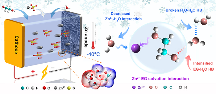 水系鋅基電池具有安全性高、成本低、能量密度高等優點,在便攜式電子設備、電動汽車和大規模儲能領域具有廣闊的應用前景。目前,水系鋅基電池面臨的主要挑戰為:鋅負極一側鋅的不均勻沉積導致枝晶生長與脫落,從而影響鋅基電池的循環穩定性;此外,水系電解液離子傳導率隨著溫度的降低而急劇下降,使得該體系電池在低溫下無法運行,大大限制了水系鋅基電池應用范圍。