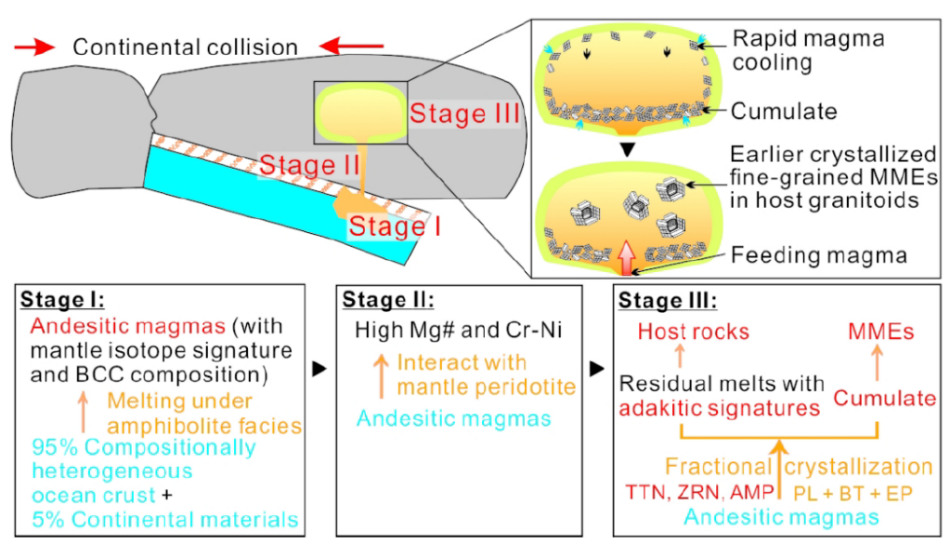 最初認為埃達克質巖漿源于俯沖年輕洋殼部分熔融,然而對其成因仍存在較大爭議。肖媛媛等人通過建立大洋巖石圈與地幔動力學超凈實驗室激光原位微區分析方法,系統研究了北祁連造山帶兩個巖體花崗巖類和鐵鎂質暗色包體(MME)中各組成礦物成分,揭示了同碰撞花崗巖類及MME中各微量元素的主要賦存礦物如榍石等和主要造巖礦物均具有很強的元素賦存能力,從礦物學的角度驗證了MME與花崗巖類都源于俯沖洋殼的部分熔融,驗證了“大陸碰撞帶為陸殼增長主要場所”這一假說。通過對比兩個巖體的礦物成分,首次揭示了埃達克質巖類高Sr/Y、La/Yb比值的特征是由母巖漿成分與母巖漿成分所影響的榍石等礦物結晶分異所造成,而決定二者的最終原因是俯沖洋殼成分的不均一性。相關成果發表在巖石學權威刊物Journal of Petrology。