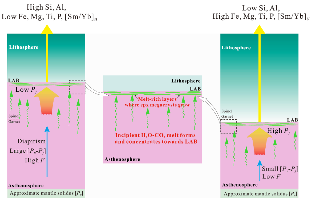 利用該平臺激光原位微區分析方法,孫普等人在整個中國東部的空間尺度上,驗證了“蓋層效應”對大陸板內玄武巖成分變化的重要影響。研究認為中國東部新生代玄武巖中捕擄的輝石巨晶結晶于巖石圈與軟流圈界面處,因此輝石巨晶的平衡壓力可以反映不同地區之下的巖石圈厚度。通過分析輝石組成,發現中國東部新生代玄武巖的成分變化與其中的輝石巨晶平衡壓力(即巖石圈厚度)變化具有良好相關性。該研究反映了“蓋層效應”在整個中國東部尺度上對大陸板內玄武巖成分變化的重要影響,對探究大陸玄武巖的地幔熔融和熔體匯聚、抽離過程具有重要意義。相關成果發表在Nature Index期刊Journal of Geophysical Research: Solid Earth。