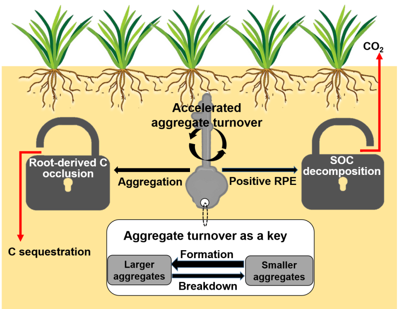 鑒于此,中國科學院沈陽應用生態研究所地下生態過程團隊借助稀土氧化物標記和天然13C同位素示蹤技術,發現植物生長和種類顯著影響團聚體周轉速率,總體表現為團聚性增加(aggregation),即大團聚體(larger aggregates)形成大于破碎過程,物種間團聚體周轉速率的差異與細根屬性有關;植物種間根際激發效應的差異與團聚體周轉速率的差異趨于一致,意味著二者之間存在著顯著的正向關聯?;谶@些新發現,發展了一個以團聚體周轉為核心的土壤有機碳動態變化框架——“key”模型(圖1):根系加速的團聚體周轉引起的團聚體破碎過程可提高根際激發效應,同時團聚體形成過程可固持根源碳,二者的平衡調控土壤碳的動態變化。該模型將為精確預測土壤有機碳動態提供理論參考。