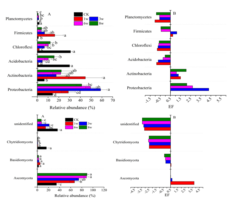 圖1 細(xì)菌和真菌優(yōu)勢(shì)門的相對(duì)豐度和富集比例