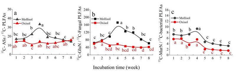 在此基礎(chǔ)上,進(jìn)一步利用磷脂脂肪酸同位素探針技術(shù)(PLFA-SIP)和氨基糖同位素探針技術(shù)(AS-SIP)相結(jié)合來評(píng)估微生物從底物利用策略到增殖-死亡過程對(duì)土壤有機(jī)碳積累的驅(qū)動(dòng)作用。我們發(fā)現(xiàn),低有機(jī)質(zhì)的紅壤對(duì)外源葡萄糖碳響應(yīng)較快,并通過較高的代謝能力和真菌殘留物的積累保持外源活性碳固持能力;而有機(jī)質(zhì)較高的黑土中微生物對(duì)外源活性碳響應(yīng)不敏感,但可通過微生物量周轉(zhuǎn)保持較高的微生物殘?bào)w積累效率,從而控制外源活性碳在黑土中的積累。因此,微生物對(duì)外源底物的響應(yīng)以及微生物從增殖到死亡的周轉(zhuǎn)以及微生物殘留物的積累和穩(wěn)定化共同控制著土壤碳截獲過程。研究成果對(duì)明確微生物底物利用和周轉(zhuǎn)對(duì)土壤有機(jī)碳形成的驅(qū)動(dòng)機(jī)制具有重要的理論意義。