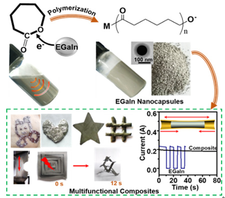 圖1. 液態金屬引發e-己內酯開環聚合制備液態金屬膠囊粉體及其應用展示。