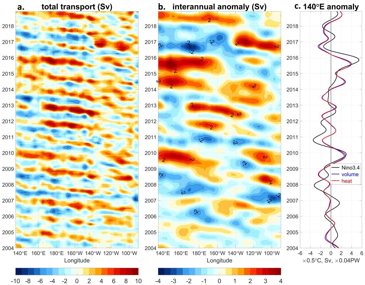 袁東亮團隊對北赤道次表層流三維結構、變異規律與動力機制開展研究,利用潛標測量、船載ADCP海流測量,并與Argo地轉流數據結合,證實NESC是一支橫跨整個北太平洋海盆流動的海流,具有顯著的季節-年際尺度的變化,在夏季和拉尼娜期間變強,在冬季和厄爾尼諾期間變弱。