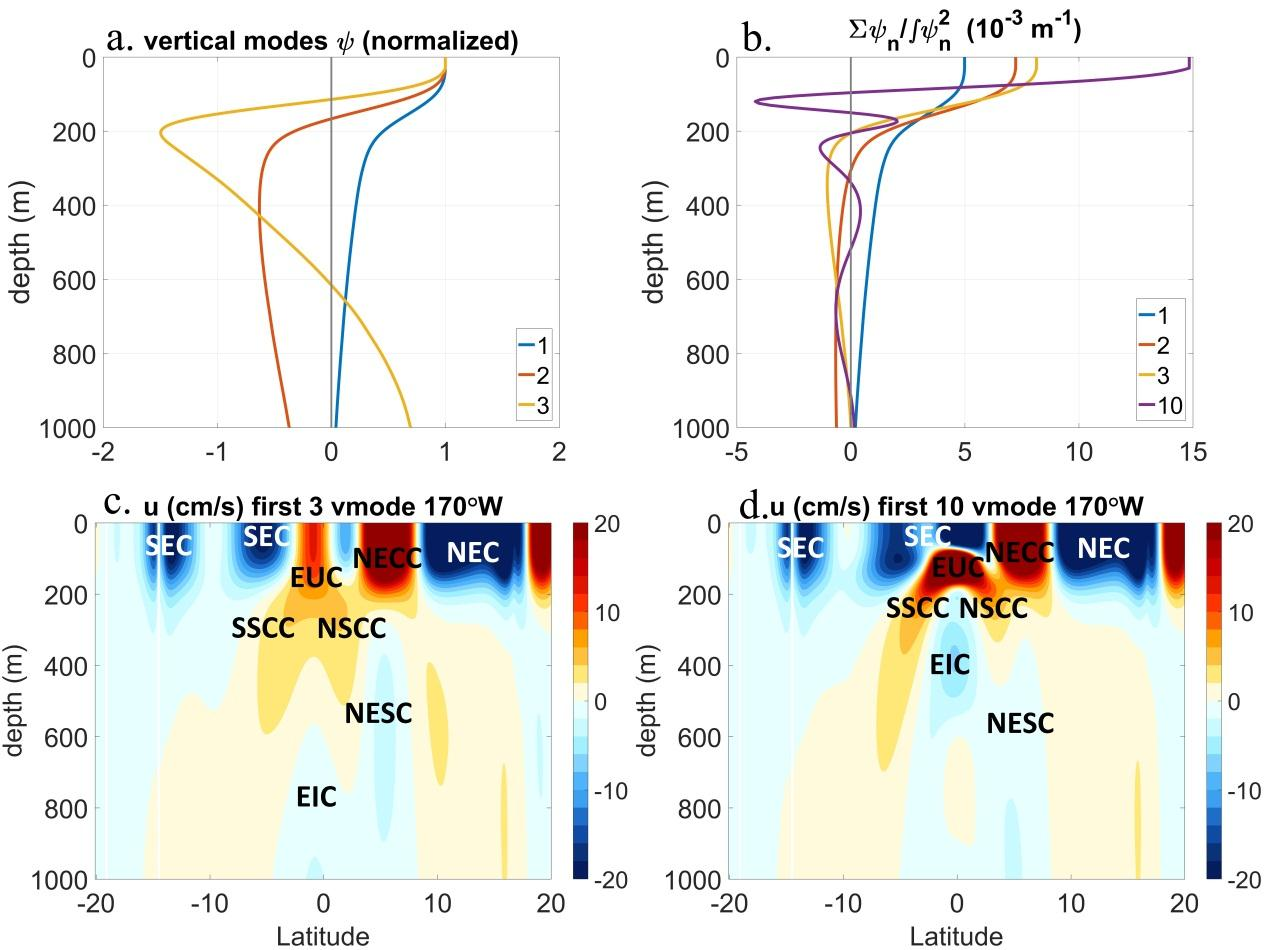 使用線性連續層化模式(LCSM ),團隊揭示了大洋次溫躍層環流的動力機制。研究指出,包括NESC在內的潛流,其形成機制是由大尺度環流的靜力平衡和海面、海底動力邊界條件約束決定。由于熱帶大洋層結的低階斜壓模態在溫躍層附近存在零點,前幾個斜壓模態的疊加造成了強的表層流與弱的潛流,模式成功再現了太平洋赤道流系的主要海流及其潛流。該理論與經典環流理論的本質區別,在于考慮了海底邊界的約束。經典理論假設約化重力模型,忽略了底邊界的影響。