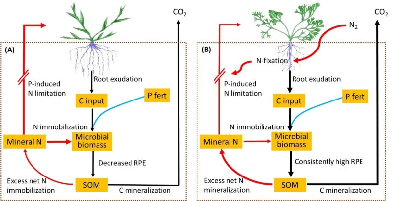 基于此,中科院沈陽應用生態所地下生態過程研究團隊聯合澳大利亞悉尼大學Feike A. Dijkstra團隊對比了黑麥草(Lolium perenne)和白三葉草(Trifolium repens)在施磷和不施磷(4 g P m-2)條件下,種植后30天,44天和58天的根際激發效應的動態差異。研究發現,白三葉草比黑麥草在生長后期產生更大的根際激發效應,這可能是由于白三葉草后期的地上生物量再生率、根際活力和根際沉積物較大。施加磷肥降低了黑麥草生長后期的根際激發效應,而對白三葉草的根際激發效應無顯著影響。背后的機制在于,磷肥和根系分泌物的碳輸入誘導了更多的微生物氮固持,導致土壤氮限制對植物生長產生負向影響,繼而降低了黑麥草的根際激發效應(圖A)。然而,磷肥誘導的微生物氮固持對白三葉草沒有太大影響,因為三葉草的生物固氮可能緩解了土壤氮限制(圖B)。總之,上述結果揭示了C-N-P的相互作用對于理解根際激發效應的重要性,這對探索植物-土壤系統中的磷循環具有重要意義。