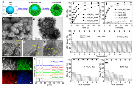 近日,青島能源所王光輝研究員帶領的多孔催化材料研究組聯合中國科學技術大學張文華副教授報道了一種新型的、具有空心結構的Ni-Al水滑石基金屬氧化物催化劑,該催化劑在 , -不飽和醛轉移加氫制備 , -不飽和醇反應中表現出優異的活性、選擇性以及穩定性。首先,該工作通過硬模板的方法(圖1a),構筑了Ni-Al基氧化物空心結構(圖1b-h),提高了催化劑的比表面積、孔隙率,增加了催化劑暴露的活性位點,同時有利于反應的傳質擴散。另外,由于Ni +(2< <3)型酸-堿活性位的形成,Ni-Al基氧化物催化劑經過循環使用12次,沒有失活現象,表現出優異的催化穩定性,而且循環過程中 , -不飽和醇的選擇性始終大于99%(圖1i-m)。進一步,Ni-Al基氧化物及轉移加氫體系對于多種 , -不飽和醛的轉移加氫反應均表現出優異性能,具有很好的工業化應用前景。