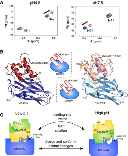 pH是幾乎所有在水溶液中進(jìn)行的化學(xué)反應(yīng)的重要因素,在生命過程中具有重要的作用。生物體中有許多pH依賴的蛋白質(zhì)功能開關(guān),不僅可調(diào)控細(xì)胞的生理和生化過程,而且可作為生物技術(shù)開發(fā)中的關(guān)鍵感應(yīng)器件和功能開關(guān)。目前已知的pH依賴的蛋白質(zhì)構(gòu)象變化都是通過感應(yīng)pH變化實(shí)現(xiàn)“打開-關(guān)閉”式的開關(guān)切換控制,發(fā)現(xiàn)新型的pH依賴的蛋白質(zhì)互作方式具有重要的科學(xué)應(yīng)用價(jià)值。代謝物組學(xué)研究組長(zhǎng)期以來以一種高效降解木質(zhì)纖維素的多酶復(fù)合體“纖維小體”為對(duì)象開展研究,并在研究一種產(chǎn)溶劑梭菌——丙酮丁醇梭菌——的纖維小體時(shí),發(fā)現(xiàn)了一種全新的pH依賴的蛋白質(zhì)相互作用變化方式。研究人員通過核磁共振技術(shù)發(fā)現(xiàn)該細(xì)菌中的一對(duì)纖維小體組裝模塊——粘連模塊和對(duì)接模塊——在低pH條件下會(huì)選擇性結(jié)合于一個(gè)位點(diǎn),而在高pH條件下選擇性結(jié)合于另一個(gè)位點(diǎn),從而形成了在不同pH條件下兩個(gè)相互作用位點(diǎn)之間的切換(圖1)。隨后,研究人員利用核磁共振、X射線晶體學(xué)、微量熱、分子動(dòng)力學(xué)模擬等多種生物物理技術(shù),揭示了這兩個(gè)蛋白模塊相互作用在pH依賴性方面的化學(xué)和結(jié)構(gòu)機(jī)制:對(duì)接模塊上兩個(gè)結(jié)合位點(diǎn)的多對(duì)不對(duì)稱殘基,以及粘連模塊上結(jié)合位點(diǎn)處的一段富含負(fù)電的柔性區(qū)殘基的pKa漂移共同造成了這對(duì)蛋白模塊相互作用的pH依賴的位點(diǎn)切換現(xiàn)象。這種精巧的pH依賴的蛋白質(zhì)互作模式不同于其他已知的pH依賴性蛋白質(zhì)互作方式,不僅揭示了生命體中可能存在的復(fù)雜分子作用機(jī)制,而且為生物材料開發(fā)、蛋白質(zhì)感應(yīng)器件設(shè)計(jì)、合成生物學(xué)元件設(shè)計(jì)等多種生物技術(shù)應(yīng)用提供了嶄新的素材和方案。