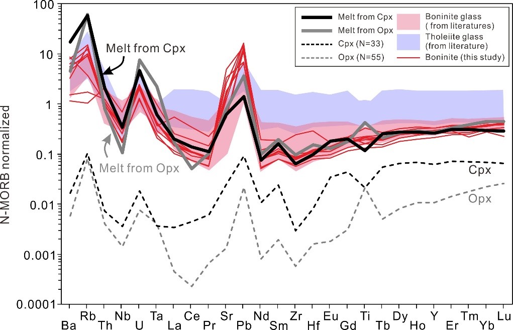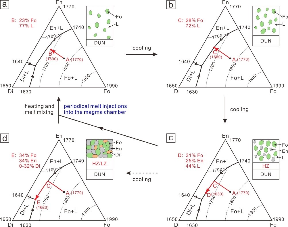 方輝橄欖巖內主要礦物為橄欖石和斜方輝石,前人認為方輝橄欖巖的巖石成因主要是地幔熔融殘余和層狀侵入體的堆晶。由于橄欖石和斜方輝石也是現代俯沖環境和蛇綠巖帶中玻安巖的主要斑晶組成,因此可以推測,堆晶的方輝橄欖巖很可能是玻安巖巖漿演化的直接產物。該研究以塞浦路斯Troodos蛇綠巖互層方輝橄欖巖(局部二輝橄欖巖)-純橄巖堆晶巖與玻安巖為例,通過野外考察采樣、巖相學、礦物學、主微量元素地球化學、巖石學數值模擬以及相平衡分析,發現與方輝橄欖巖、純橄巖堆晶中尖晶石平衡的熔體主量元素組成與Troodos玻安巖相似,計算的與方輝橄欖巖堆晶中斜方輝石、單斜輝石平衡熔體的微量元素組成模式與Troodos玻安巖一致,且玻安巖熔體演化的巖石學模擬顯示了橄欖石、斜方輝石、單斜輝石、斜長石的結晶順序,這與方輝橄欖巖堆晶一致 ,證明了Troodos蛇綠巖中超鎂鐵質的互層方輝橄欖巖(局部二輝橄欖巖)-純橄巖是玻安巖巖漿在開放巖漿房系統中分離結晶、伴隨周期性母巖漿充注的產物。