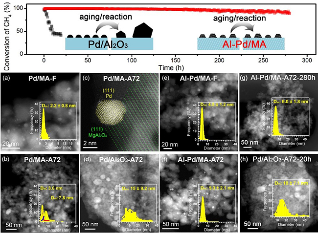 近日,中國科學院大連化學物理研究所催化與新材料研究室研究員李為臻、研究員喬波濤、院士張濤團隊與北京大學馬丁教授合作,在高穩定Pd基甲烷燃燒催化劑制備方面取得新進展,以鎂鋁尖晶石(MgAl2O4)為載體,通過添加非還原性氧化物(Al2O3, ZrO2, SiO2)抑制Pd的過度氧化,實現了Pd納米粒子的高水熱穩定性。