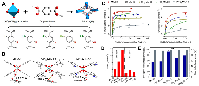 該團(tuán)隊以高穩(wěn)定性MOF材料出發(fā),基于多種官能化苯二甲酸配體,構(gòu)筑系列“等網(wǎng)格”材料。研究表明,鍵合甲基的水合型MOF材料呈現(xiàn)優(yōu)異的生物糠醛吸附性質(zhì),在極低糠醛水溶液體系中(0.5-3wt.%)捕集率達(dá)到98%,且相對于木糖(糠醛制備原料)而言,材料呈現(xiàn)100%糠醛專一性吸附。此外,該團(tuán)隊與山東大學(xué)鄧偉僑團(tuán)隊合作,通過系統(tǒng)理論計算,證實(shí)了材料與糠醛之間“以水為橋”的獨(dú)特氫鍵鏈接方式,以及水合材料對糠醛有顯著提高的結(jié)合能。除吸附外,實(shí)驗(yàn)證實(shí)鍵合甲基的水合型MOF材料的糠醛脫附回收率最優(yōu),達(dá)到了93%,這對實(shí)際工業(yè)過程中糠醛的回收,以及吸附材料的循環(huán)利用具有重要意義。
