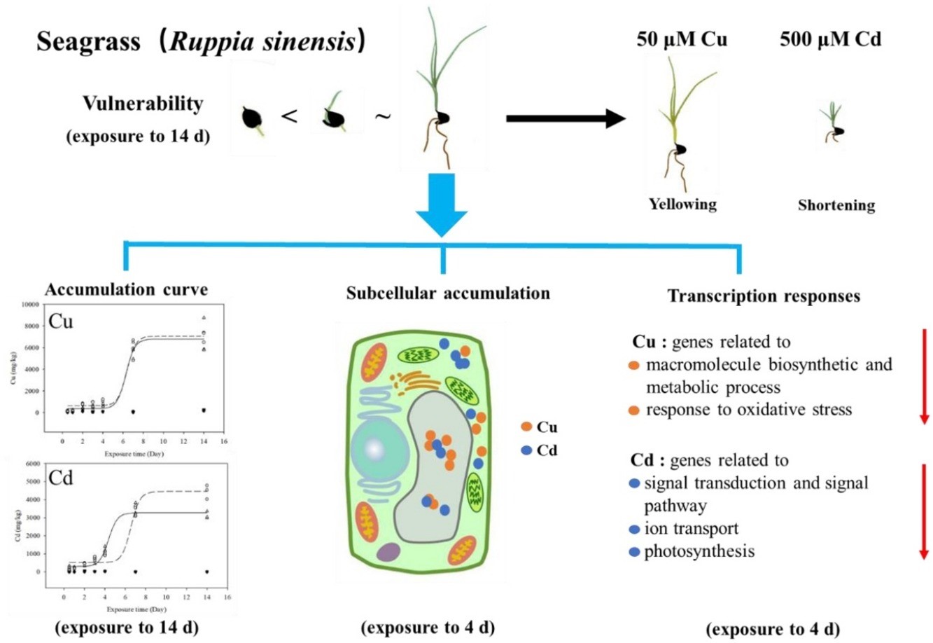 近日,國際學術刊物Journal of Hazardous Materials (IF=9.038) 在線刊發了海洋所楊紅生課題組最新研究成果“Programmed responses of different life-stages of the seagrass Ruppia sinensis to copper and cadmium exposure”。該研究解析了海草植物——中國川蔓草(Ruppia sinensis)不同生活史階段對銅(Cu)和鎘(Cd)的耐受性及毒性效應機制。研究結果為理解沉水植物對重金屬元素的吸收與減毒機制提供了新視角。此外,結果還展現了中國川蔓草這一物種對于水環境中Cu、Cd的生物指示與修復潛力。