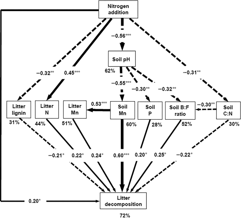 中國科學院沈陽應用生態研究所生態化學計量組研究團隊與中科院植物研究所及法國國家科研中心等單位合作,以中國北方半干旱草原長期氮素添加的實驗平臺為依托,在物種和群落水平上研究了氮沉降對該地區植物凋落物分解的影響。結果表明:氮素添加促進了物種水平和群落水平的凋落物分解,這種促進作用是由多種因素共同驅動。其中,氮素添加誘導的土壤酸化所導致的土壤中錳元素有效性增加是促進凋落物分解的重要因素。氮素添加通過降低土壤碳氮比和提高土壤細菌和真菌比也促進了凋落物分解,而氮素添加導致的凋落物化學質量增加對凋落物分解的促進作用相對較小。本研究揭示的這種土壤驅動作用對凋落物分解過程的改變可能持續地影響生態系統的養分循環、土壤有機質動態及生態系統功能。