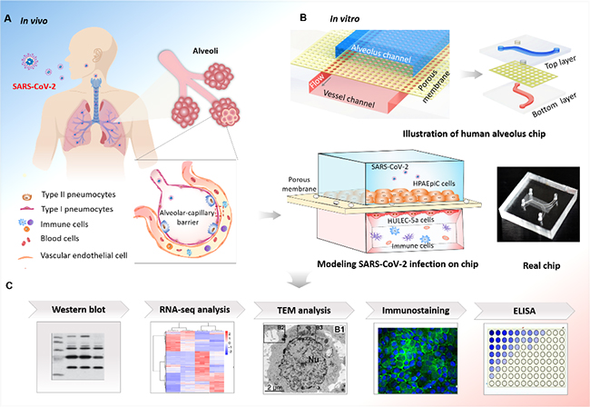 肺泡是人體肺臟的基本功能單位,其中肺泡—毛細血管屏障對于維持肺臟氣體交換和抵御外界病原體感染至關重要。本工作中,研究者首先利用器官芯片技術仿生構建了人體肺泡功能單元,并進一步開展新冠病毒感染實驗。研究者從人體肺組織復雜結構與功能特點出發,在具有多層分腔設計的可灌注微芯片中模擬人體肺泡組織微環境;實驗中,在芯片多孔膜兩側(肺泡側/血管側)的微腔內,通過人肺泡上皮細胞、肺微血管內皮細胞和人外周血免疫細胞的動態共培養,建立了包含多種人源細胞、機械流體和組織界面等復雜因素的功能性肺泡—毛細血管屏障,并進一步在中科院昆明動物所BSL-3實驗室內開展芯片上的攻毒試驗。