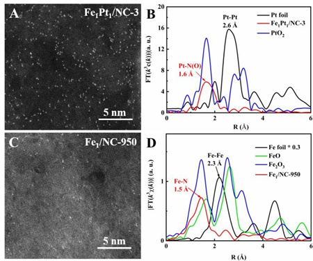圖2 Fe1Pt1/NC和Fe1/NC的球差電鏡和EXAF表征圖
