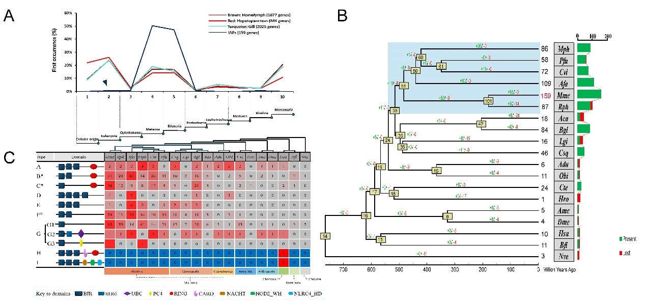 IAP基因家族的起源(A)、擴(kuò)張(B)和結(jié)構(gòu)分化(C)