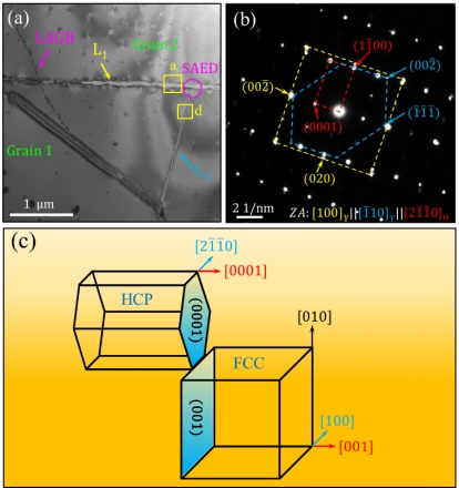 近期,李閣平研究組在大量透射電子顯微鏡實驗研究基礎上,發現了一種新位向關系的FCC相。經過選區電子衍射標定,這種類型FCC相與基體的位向關系為: