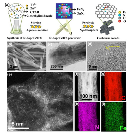 近日,青島能源所梁漢璞研究員帶領(lǐng)的能源材料與納米催化研究組,在利用可循環(huán)再生的生物質(zhì)制備Fe1單原子(Carbon, 2020, 157, 614-621. DOI: 10.1016/j.carbon.2019.10.054.)和Fe1Pt1雙單原子(ACS Sustain. Chem. Eng. 2021, 9, 1, 189–196. DOI: 10.1021/acssuschemeng.0c06558.)的基礎(chǔ)上,又開發(fā)出了一種步驟簡單、過程環(huán)保的合成方法用來制備具有氮摻雜的多孔碳納米棒負(fù)載的Fe單原子催化劑(圖1a)。該方法實現(xiàn)了在水系中合成具有Fe均勻摻雜的金屬有機框架材料前驅(qū)體,后續(xù)經(jīng)過一步高溫?zé)峤猓诓恍枰?jīng)過酸洗處理的情況下即可獲得高度均勻分散的Fe單原子催化劑。所合成的催化劑電鏡表征見圖1(b-i)。該催化劑展現(xiàn)了優(yōu)良的氧還原催化活性和長時間穩(wěn)定性。在堿性介質(zhì)中,其起始電位和半波電位比商業(yè)Pt/C催化劑分別高出了30 mV和60 mV。經(jīng)過20小時的穩(wěn)定性測試,商業(yè)Pt/C催化劑損失達(dá)到了53%而所合成催化劑僅損失5%。在酸性介質(zhì)中也展現(xiàn)出了較好的催化性能。作為負(fù)極材料組裝到鋅空電池當(dāng)中,實現(xiàn)了142 mW cm-2的高功率密度,比商業(yè)Pt/C電池高出了近58 mW cm-2,并優(yōu)于大多數(shù)已經(jīng)報道的過渡金屬單原子催化劑。該研究工作為簡單、綠色地合成氮摻雜碳負(fù)載Fe單原子電催化劑提供了一種有效途徑。相關(guān)成果近期發(fā)表在《ACS Sustainable Chemistry & Engineering》雜志上(ACS Sustainable Chem. Eng. 2021, 9, 137-146)。