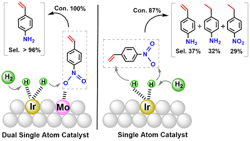 本工作發(fā)現(xiàn),在4-硝基苯乙烯選擇性加氫反應(yīng)中,雙單原子催化劑Ir1Mo1/TiO2對(duì)4-氨基苯乙烯的選擇性大于96%,遠(yuǎn)遠(yuǎn)優(yōu)于單原子催化劑Ir1/TiO2(37%)和Mo1/TiO2(無活性)。理論計(jì)算表明,Ir單原子位點(diǎn)促進(jìn)氫氣的活化,Mo單原子位點(diǎn)吸附硝基苯乙烯,二者的協(xié)同作用提高了催化加氫的性能。