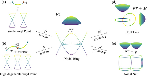 基于以上挑戰(zhàn),科研人員優(yōu)化了拓?fù)洳蛔兞康挠?jì)算實(shí)現(xiàn)高效、便捷的拓?fù)浞治觯_(kāi)發(fā)了高通量拓?fù)渎曌佑?jì)算軟件包HT-PHONON,從聲子力常數(shù)到拓?fù)洳蛔兞康挠?jì)算分析,從拓?fù)渎曌泳_位置到類別刻畫,從拓?fù)涮匦缘奖砻鎽B(tài),并最終分類入庫(kù)實(shí)現(xiàn)了一套高通量全自動(dòng)的計(jì)算框架。在這個(gè)過(guò)程中他們還發(fā)現(xiàn)了許多新奇的拓?fù)渎曌硬牧希绱髷?shù)據(jù)分析到的322個(gè)干凈的拓?fù)渫鉅柭曌硬牧稀⑸陈┬屯負(fù)渎曌硬牧虾投嘀赝鉅柭曌硬牧系龋徊⑦M(jìn)一步闡述了不同類別的拓?fù)渎曌影l(fā)生的條件和它們彼此之間的關(guān)聯(lián),澄清了時(shí)間反演或者空間反演對(duì)稱破缺、或非點(diǎn)式空間群(螺旋軸或滑移反映面)等操作對(duì)產(chǎn)生奇特拓?fù)渎曌討B(tài)的關(guān)鍵作用和相互關(guān)系;在TeO3等材料中揭示了受非點(diǎn)式空間群保護(hù)的沙漏型拓?fù)渎曌樱辉贚iCaAs和ScZn等材料中揭示了恰好在聲學(xué)支和光學(xué)支接觸處存在的拓?fù)渎曌討B(tài),具有顯著的抑制聲子散射作用;在非傳統(tǒng)超導(dǎo)體AuBe中發(fā)現(xiàn)三重和四重外爾聲子共存,表面會(huì)產(chǎn)生極長(zhǎng)的受拓?fù)浔Wo(hù)的聲子弧態(tài)等新奇的拓?fù)渎曌硬牧希磥?lái)還有更多有趣的拓?fù)渎曌又档萌ヌ剿鳌?nbsp;