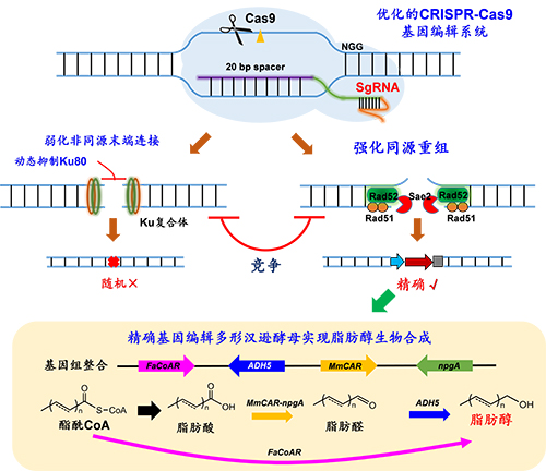 近日,中國科學院大連化學物理研究所生物催化創新特區研究組研究員周雍進團隊實現了甲醇酵母的高效精確基因編輯。該團隊在甲醇酵母代表菌株多形漢遜酵母中,建立了具有高同源重組效率的精準基因組編輯工具,初步揭示了同源重組和非同源末端連接修復方式的競爭機制;利用該高效遺傳操作平臺,構建了多形漢遜酵母細胞工廠,實現以葡萄糖和甲醇為底物生物合成精細化學品脂肪醇。