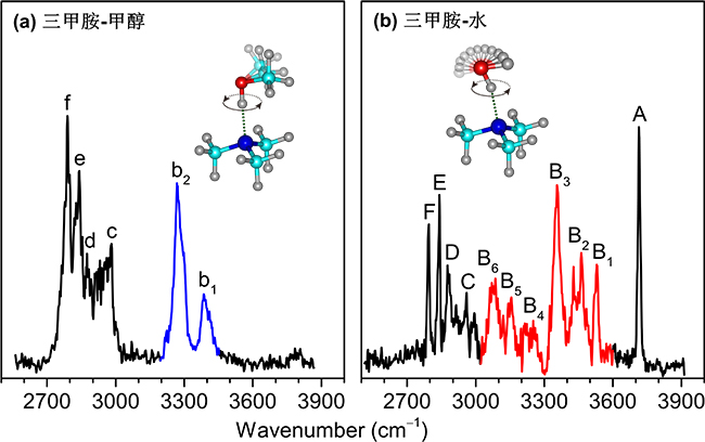氫鍵是霧霾顆粒物、分子自組裝、生物體系等主要分子間作用力。由于氫原子的質量非常輕,意味著氫鍵本質上是波動的,這對確定結構、性能和反應機理等方面起著關鍵作用。由于三甲胺分子的氮原子孤對電子可以與水和甲醇等溶劑分子形成較強的氫鍵,三甲胺團簇的研究備受關注。1962年,D. J. Millen等人使用傅里葉紅外光譜儀測得了三甲胺-甲醇的紅外光譜,發現了一個較寬的OH伸縮振動峰,但由于該紅外吸收光譜的分辨率太低,“溶劑分子在氫鍵波動中起著什么樣的作用?”“什么樣的分子運動引發了如此之大的氫鍵波動?”等關鍵科學問題一直沒有答案。