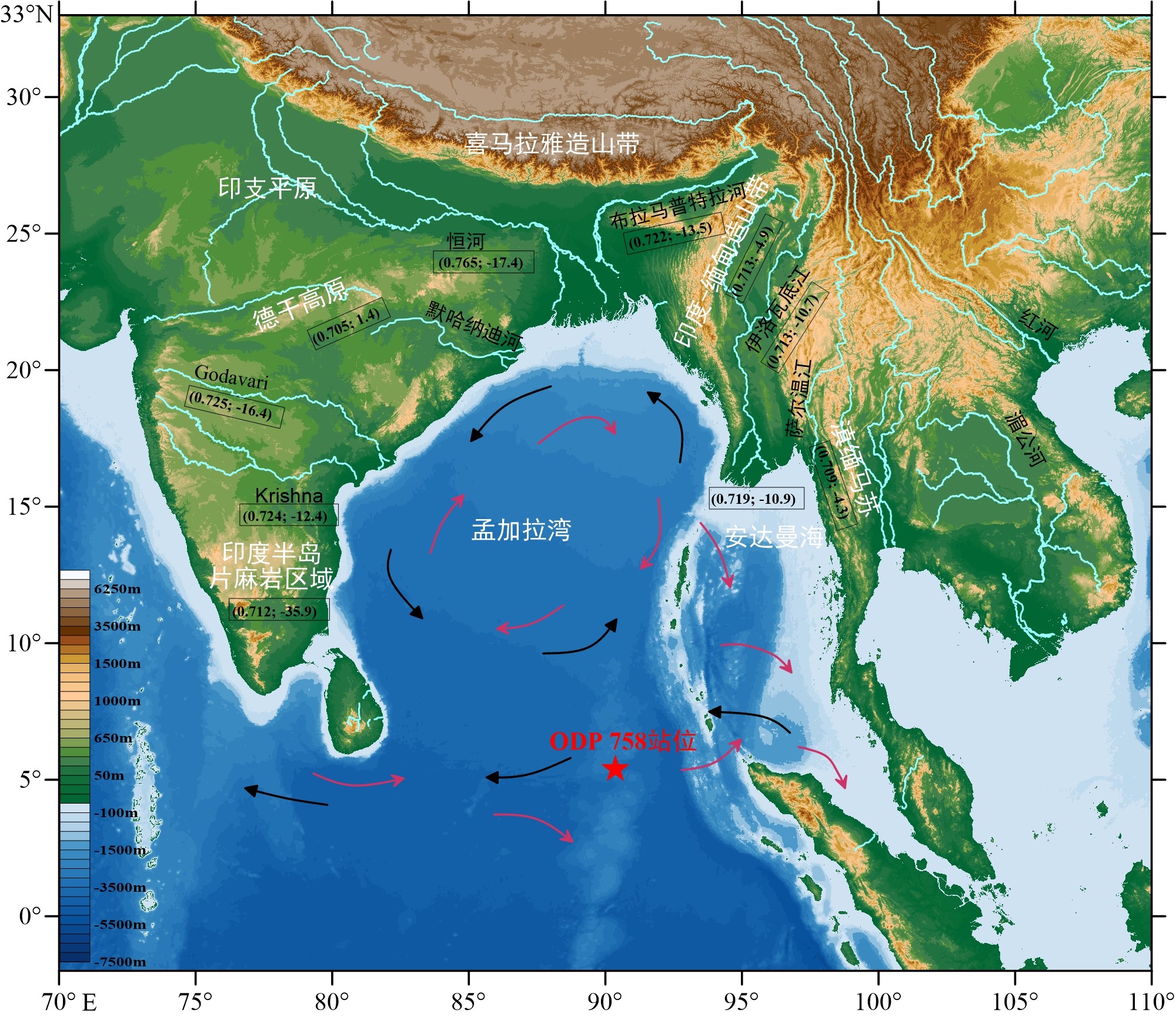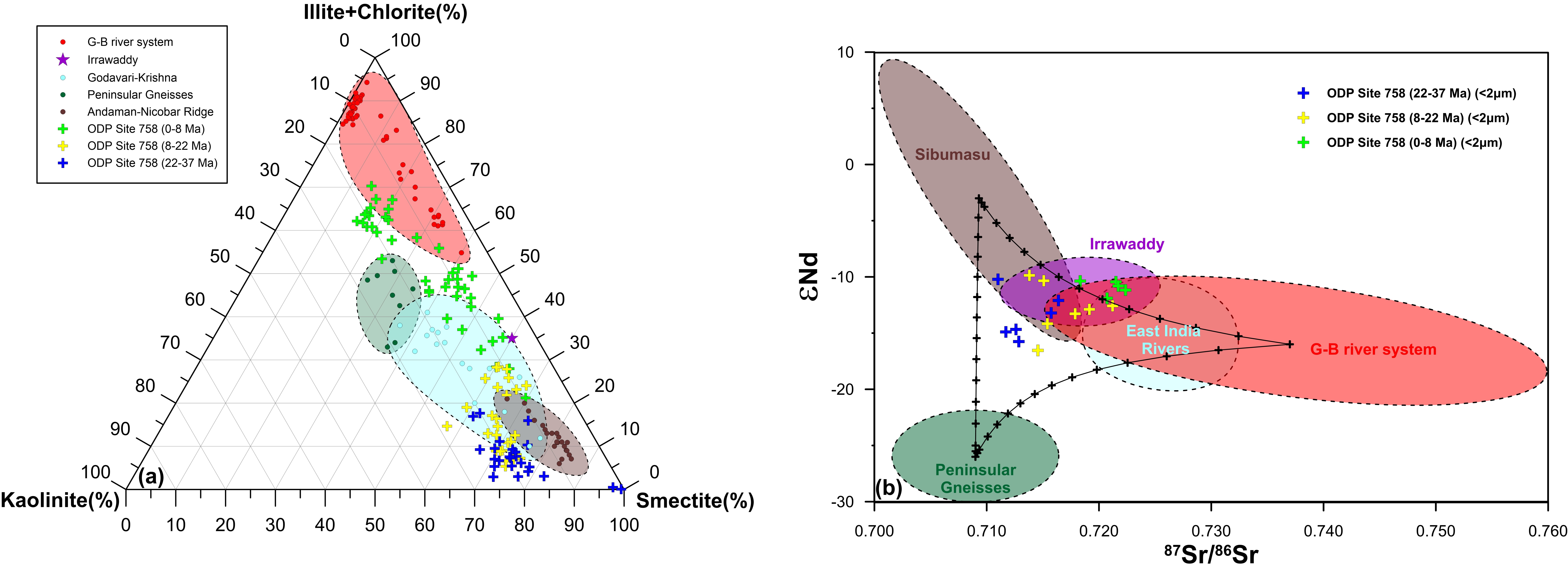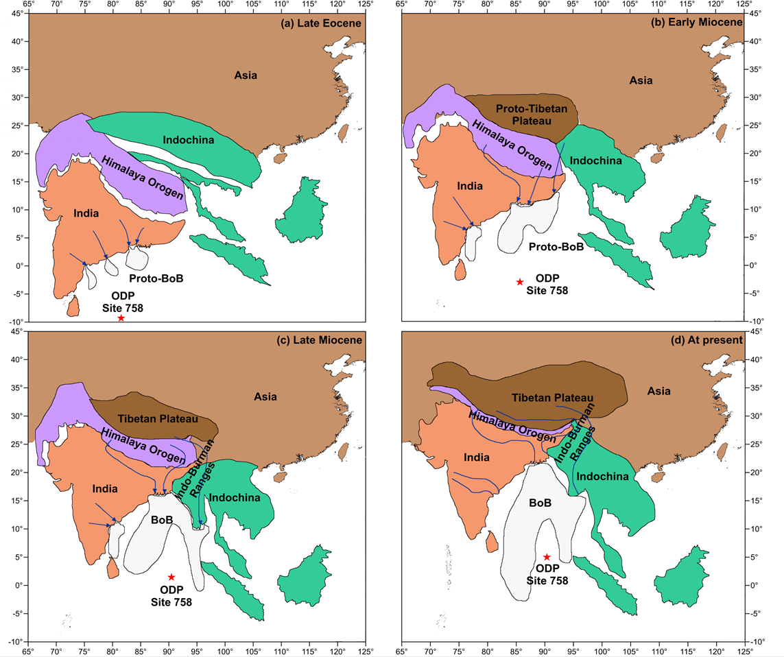 研究人員利用大洋鉆探計劃(ODP)121航次在東經九十度海嶺北端鉆取的758站位巖芯沉積物,基于極好的鈣質超微化石和硅藻生物地層年代約束,通過粘土礦物學以及Sr-Nd同位素地球化學方法,研究了晚始新世約3700萬年前以來孟加拉灣南部沉積物物源演化,揭示了南亞河流系統的形成演化歷史及其與喜馬拉雅隆升和新生代氣候變冷之間的聯系。
